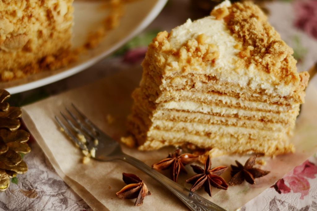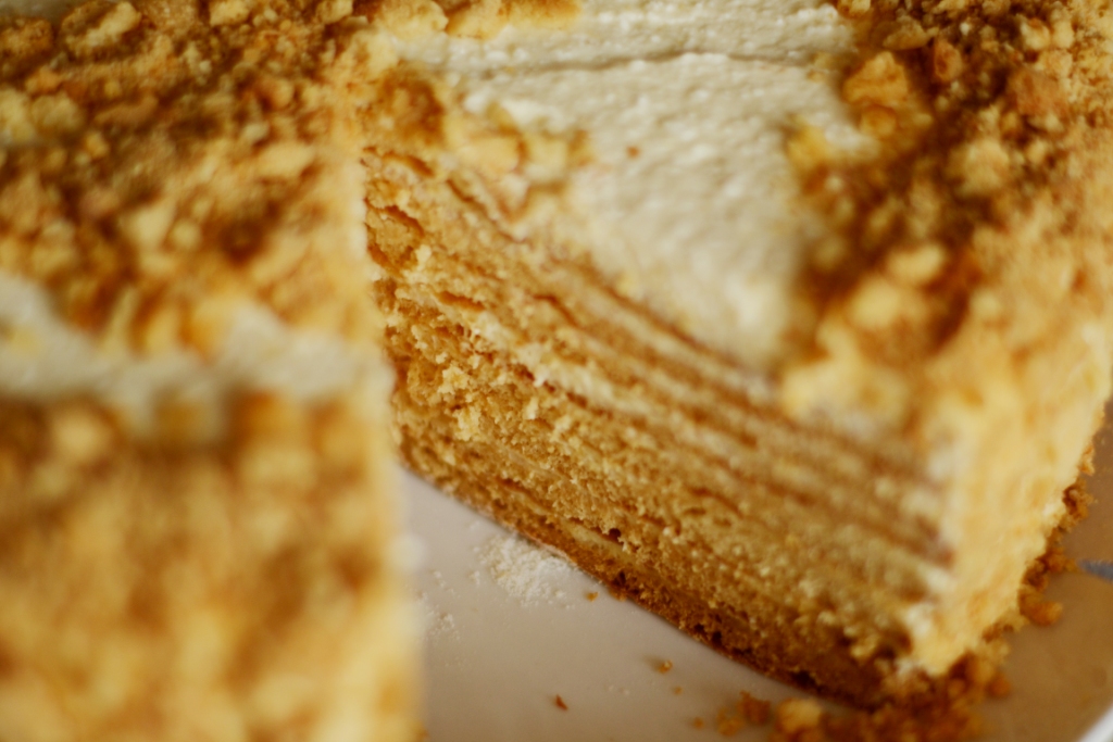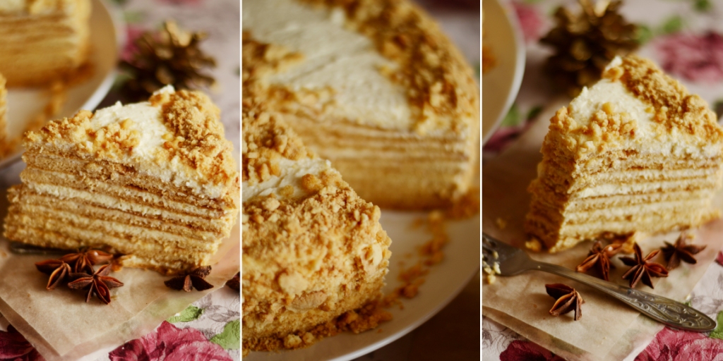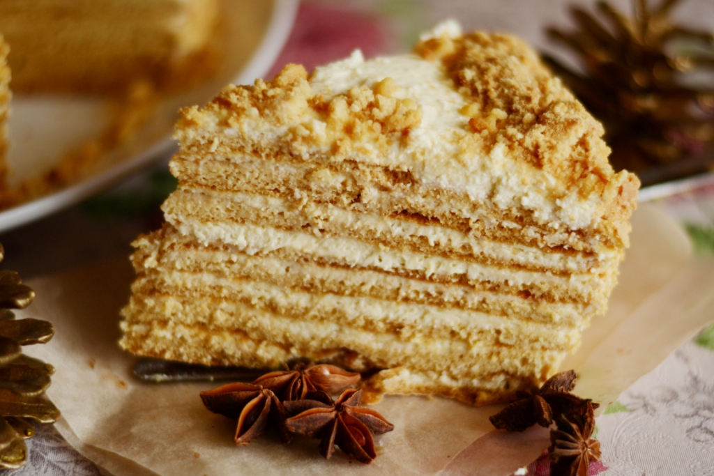 Мягкие коржи с легкой медовой ноткой, ванильный, легкий, сливочный крем - дуэт просто превосходный. Готовится торт достаточно легко, просто много времени идет на то, чтобы раскатывать каждый корж, ждать, пока он испечется, обрезать его и снова всё сначала, и так 8 раз подряд :D