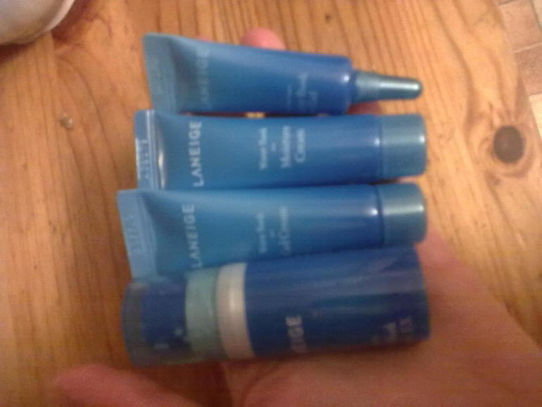 На фото все 4 пробничка у меня на ладони. Сюда входит: 1. Water Bank Essence 10 мл - интенсивная увлажняющая эссенция;
