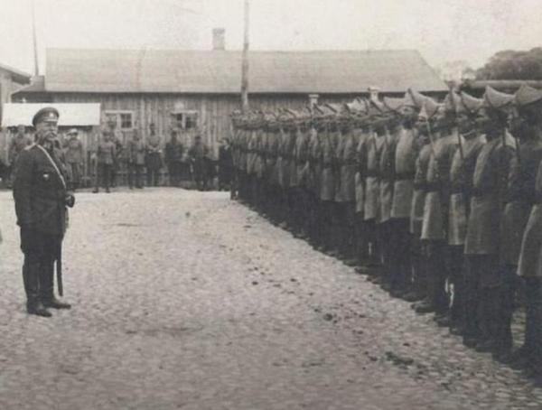 Почесна сотня "Сірої" дивізії вітає свого отамана Віктора Сокиру-Яхонтова. Володимир-Волинський, 27 травня 1918 року. Джерело: ЦДАВО України, ф. 4465, оп. 1, спр. 359, арк. 46. (подяка за світлину Івану Гоменюку)
