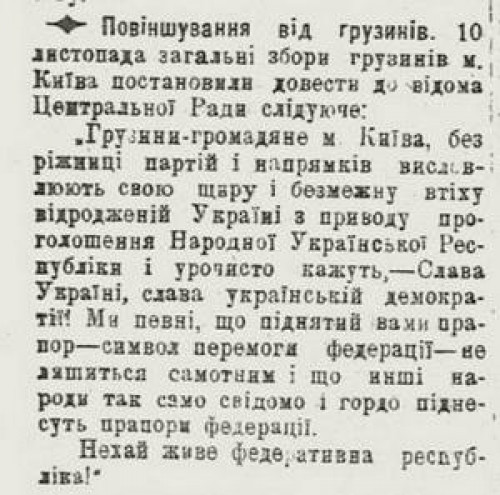 Мабуть перше вітання "Слава Україні!", яке виголосили грузин ("Нова рада" від 12.11.1917)