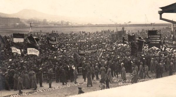 Демонстарація у Владивостоці з українськими прапорами і гаслами. Ймовірно – весна 1917 року