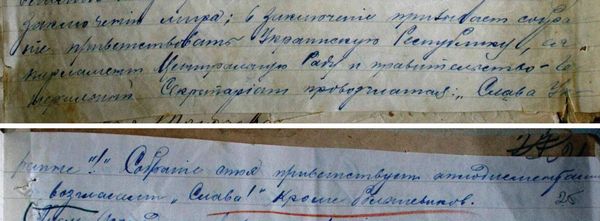 З протоколу об’єднаного засідання президій 26 організацій міста Шостка (в тому числі єврейської партії "Бунд" і "Цеире-Цион"), 13 грудня 1917 р.: "Докладчик призывает собрание приветствовать Украинскую Республику, ее парламент – Центральную Раду и правительство – Генеральный Секретариат, провозглашая: "Слава Украине!" Собрание стоя приветствует аплодисментами и возгласами "Слава!", кроме большевиков". Джерело: ДАСО. Р-1811. - Оп. 1. – Спр. 1 (подяка за ілюстрацію Антон Земанек)