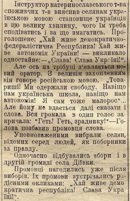 "Проголошення "слава" Україні, славному отаманові Петлюрі, всім проводирям і непереможному війську викликало ентузіазм".