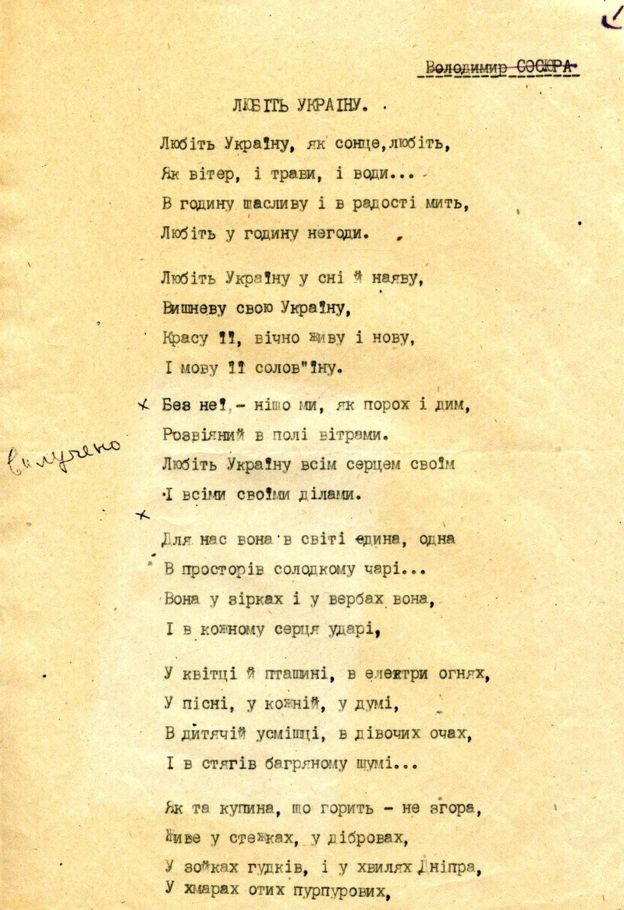 «Володимир Сосюра визнав справедливу критику його iдейно порочного вiрша «Любiть Україну», запевнив пленум, що вiн зробить усе, щоб виправити iдеологiчнi перекручення та помилки, допущенi ним у своїй творчостi»