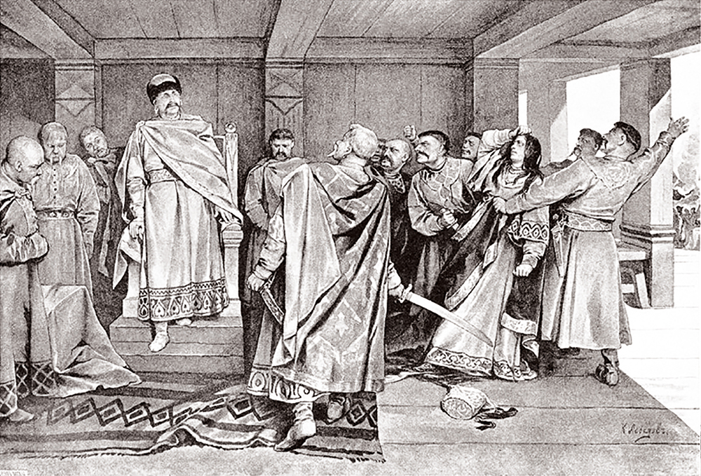 Первая среди нечистых. Галицкие ведут на костёр любовницу князя Ярослава Осмомысла Настаську Чагровну. Клавдий Лебедев, рисунок