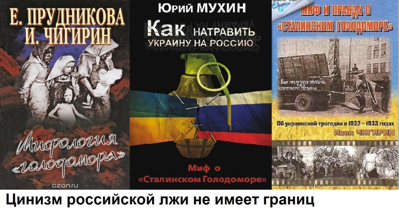 Со временем цинизм российских историков (что уж тут говорить о политиках) превзошёл все грани. Выступая на Первом канале российского телевидения, директор Института российской истории РАН академик А. Сахаров, пойдя на побегушках у российских властей, заявил: «Геополитически украинское руководство ориентировано на Запад, на США. Украина расколота... И проблема голода — очень удобный момент, когда можно сплотить весь украинский народ на антироссийских тенденциях». А теперь приведём факты того, как в россии серьёзные историки занимаются изучением голода 1932–1933 годов. В 2007–2008 годах в россии под эгидой Министерства культуры и массовых коммуникаций рф и в сотрудничестве с государственными архивными учреждениями Беларуси, Казахстана и Украины развернулась подготовка сборника «Голод в СССР, 1932–1933».
