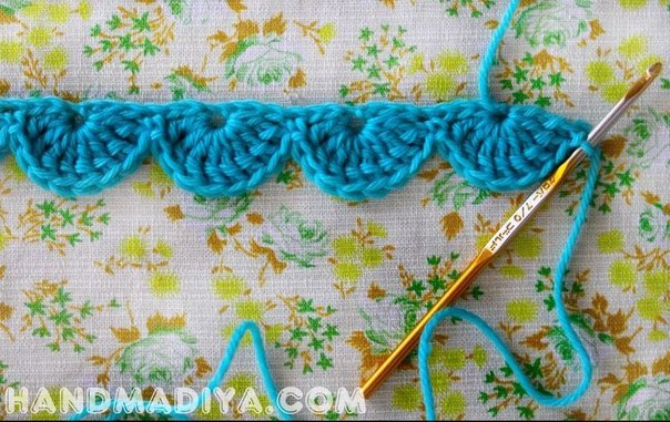 После вяжем простой столбик в четвертую с краю петлю в цепочке. Далее вяжем до конца цепочки такие же полукруги.