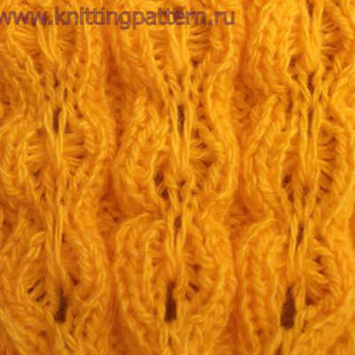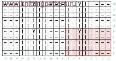 Y - ввести спицу в петлю первого ряда (на 8 рядов ниже), петлю провязать лицевой, остальные петли распустить