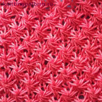 5Ж - 5 петель снять на правую спицу, при этом следующие за ними накиды спустить со спицы, после этого снова взять на левую спицу 5 вытянутых петель. Потом эти 5 петель провязать вместе лицевой скрещенной, но не спускать с левой спицы, сделать накид, еще раз вывязать из провязанных вместе петель 1 лицевую, еще накид, и еще раз провязать петли лицевой. Затем спустить провязанные петли с левой спицы