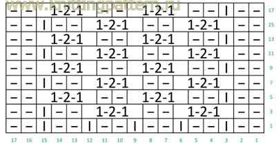 1-2-1 - обхватить 4 петли: из промежутка между четвертой и пятой петлями вытянуть на себя правой спицей нить от клубка. Образовалась обхватывающая петля. Провяжите первую из обхваченных петель лицевой и протяните ее в обхватывающую петлю. Затем провяжите оставшиеся петли - 2 изнаночных, 1 лицевая
