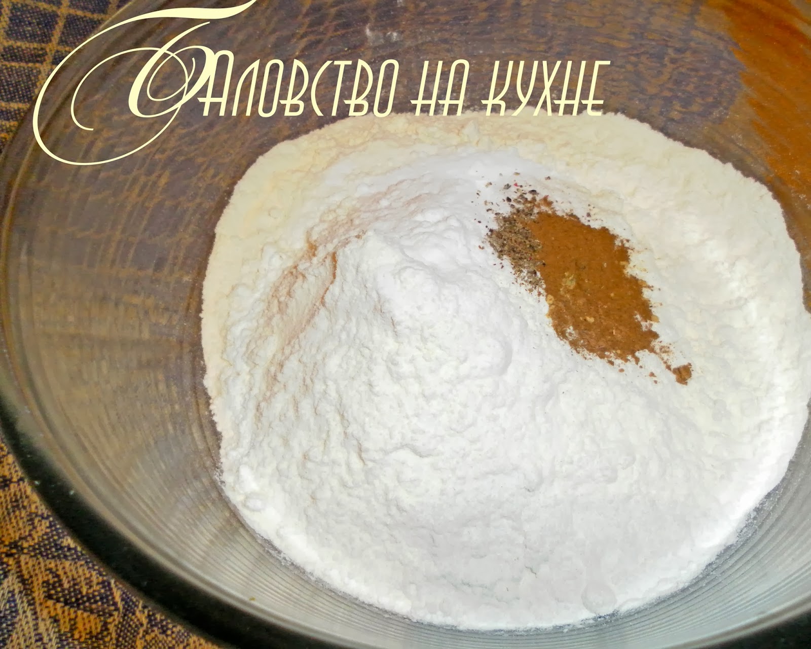 Просеять муку,добавить соду и специи хорошо соединить.