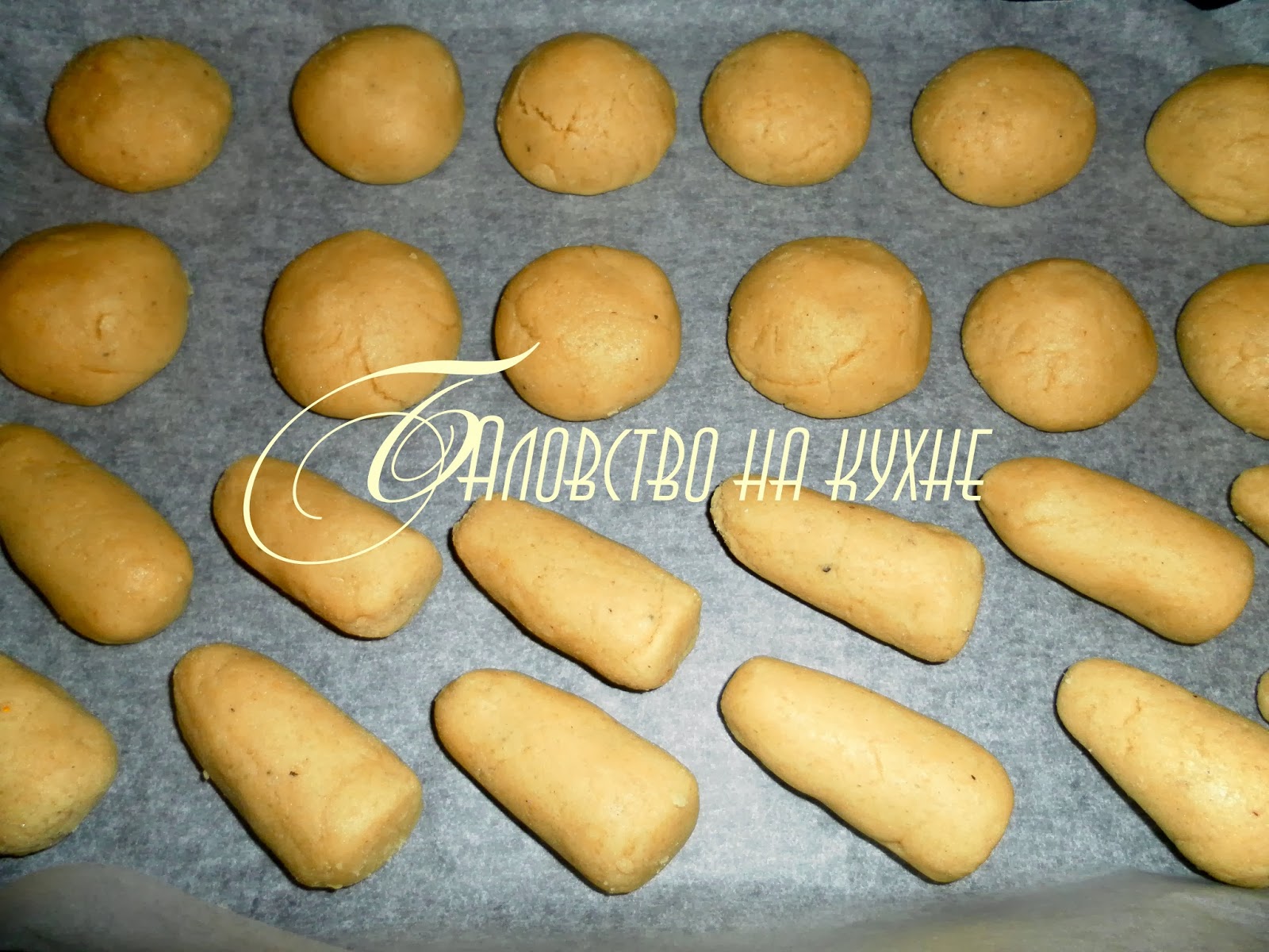 Противень застелить бумагой для выпечки,кладём на неё шарики и ножки