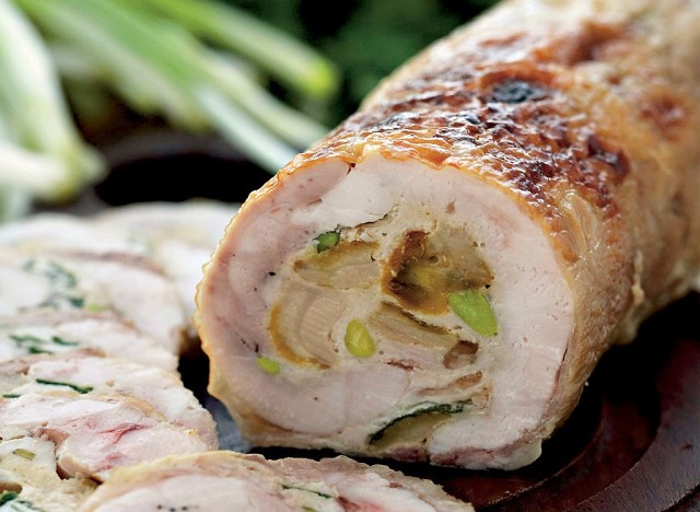Удалите кончики крыльев. Курицу положите грудкой вверх, проведите ножом параллельно килевой кости сначала с одной стороны, потом с другой и аккуратно отделите от грудки. Не повреждая кожу, подрежьте позвоночник, ребра и тазовые кости. Удалите хребет вместе со всеми костями, затем гузку и остатки шеи. Подрежьте сухожилия на крыльях. Точно так же подрежьте сухожилия на бедренных костях. Удалите кости вместе с хрящевой тканью. Полностью распластайте тушку. Разрежьте грудки вдоль и разверните как книжки, чтобы равномерно заполнить те места, где мяса меньше. Срежьте мясо с ножек и грудок так, чтобы слой мяса везде составлял 5–7 мм. Срезанные куски используйте как «заплатки» в тех местах, где мяса мало. Накройте тушку двойным слоем пленки и отбейте молотком, чтобы выровнять поверхность. Затем снимите пленку, посыпьте курицу солью и перцем, при желании положите замоченные листы желатина или присыпьте порошком желатина – он скрепит слои и это поможет вам при нарезке готового рулета. Приготовьте начинку по вашему выбору (мы использовали обжаренные грибы, зелень, яйца, соль и перец). Выложите ее на курицу ровным слоем толщиной около 1 см. При помощи пленки сверните курицу в плотный рулет, затем еще несколько раз оберните его пленкой. Старайтесь делать это так, чтобы между слоями пленки не оставалось воздуха. Перевяжите свободные края пленки толстой ниткой или шпагатом. Приготовьте пряный бульон (лавровый лист, коренья, перец и столько соли, чтобы бульон был слегка пересолен), доведите до кипения. На дно большой кастрюли поместите перевернутую вверх дном тарелку, чтобы пленка не прикипела, на нее положите рулет. Закройте крышкой и варите на минимальном огне 40 минут. Выньте рулет из бульона, остудите. Покройте глазурью из соевого соуса и меда, затем запекайте в духовке при 180 °C 15 мин. Готовый рулет нарежьте, подавайте горячим или холодным. Начинки для рулета Вы можете каждый раз делать рулет с новой начинкой, и вкус будет разный! 1. варенные яйца с зеленью; 2. обжаренные грибы, лук, морковь; 3. картофельное пюре с сыром и зеленью; 4. куриная печенка, тушенная с луком, и чернослив; 5. консервированные ананасы.