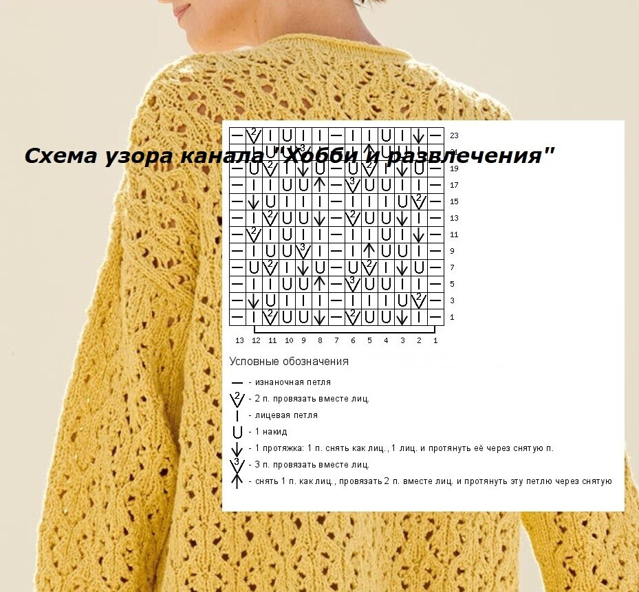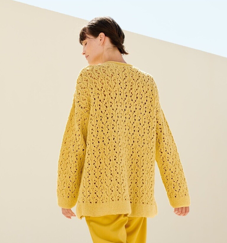 Ажурный узор легко вязать. Раппорт составляет всего 12 петель и 11 рядов. Кардиган солнечного цвета связан из пряжи в составе которой 70% хлопок, 20% лен и 10% полиамид. Нити толстые: 50гр/100м. Для вязания кружевного кардигана использовали спицы № 4,5 мм.