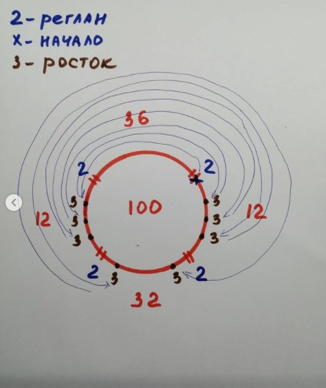 Затем распределяем линии реглана, вяжем росток и сам реглан (см. схему). Что такое "росток" - объясняю для начинающих. Некоторые его не вяжут, но в реале у нас спина как бы круглее переда, и если при вязании по кругу не связать чуть выше на спинке место горловины, то (особенно это видно , когда нет ворота) - горловину будет как бы тянуть назад. "Росток" - это подгонка линии горловины под нашу анатомическую конструкцию - линия выреза на спинке поднимется, так как число рядов на спинке будет выше переда. Все ряды при вывязывании ростка показаны на схеме.