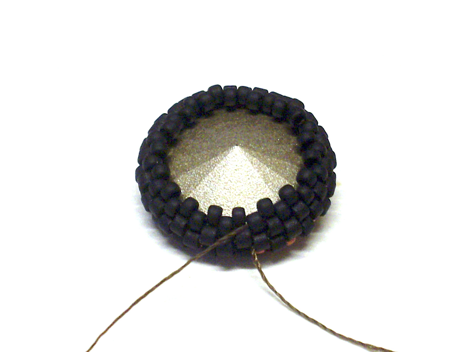 10. В принципе этого уже достаточно, но если планируются серьги, или если предполагается, что зеркальная часть кристалла может повредиться, то обратную сторону риволи нужно закрыть бисером целиком. На это есть множество способов, в зависимости от рисунка и размера используемого бисера, но все они сводятся к тому, что нужно постепенно убавлять бисеринки в ряду, например так: