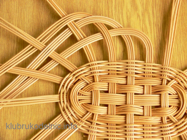 3. Потом протянем снизу два прутика, что достигнем чередующего переплетения. Сделаем четыре ряда тем же способом а после этого начнем разворачивать плетение так, что центральное длинное ребро и крайние короткие разделим пополам и оплетем их. Остальные ребра оставим по четыре веточки.