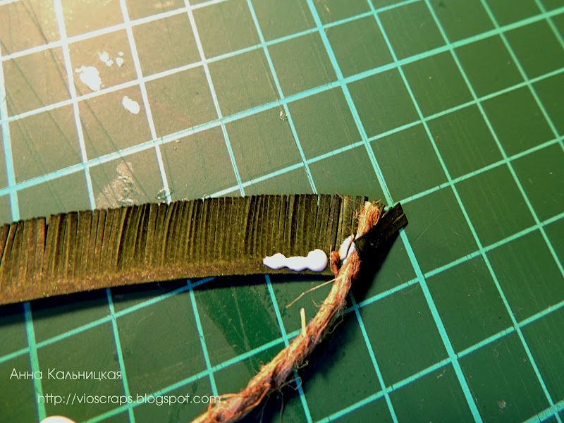 Капаем на край более темной стороны немного клея и приклеиваем нашу полоску бахромы к кончику веревки под углом.