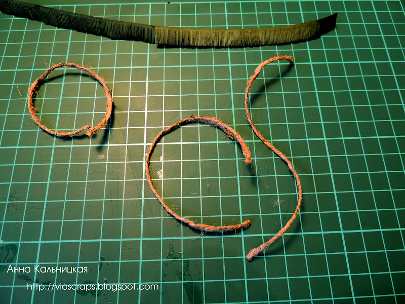 Далее нарезаем 3 кусочка веревки по 15 см. Веревка не обязательно должна быть именно такой, можно использовать любую другую, вощеный шнур, например.