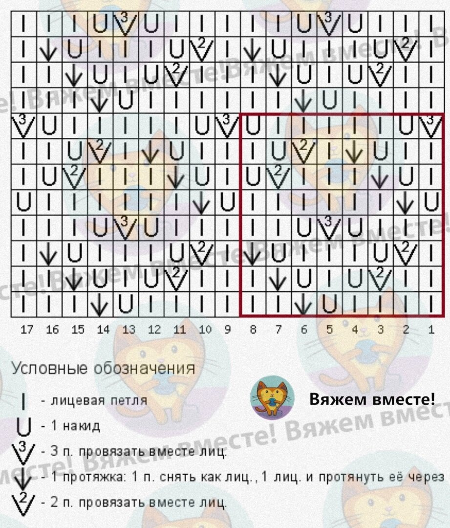 Ажурный узор выполняется на фоне лицевых петель. Здесь нужно лишь вязать лицевые петли, выполнять накиды и делать симметричные им убавления согласно схеме.