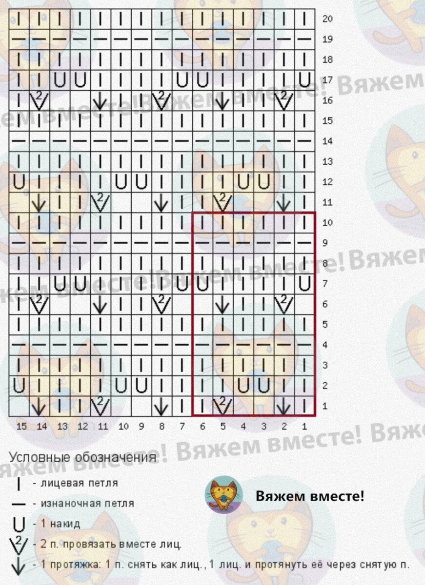 Раппорт узора равен 6 петлям по ширине полотна и 10 рядам по высоте. Обратите внимание, что на схеме даны как лицевые, так и чётные ряды вязания. Петли чётных рядов обозначены так, как они лежат на лицевой стороне полотна.