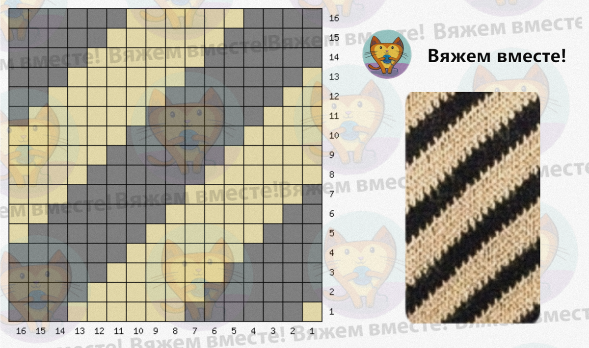 На что стоит обратить внимание: на схеме обозначены как лицевые, так и чётные ряды вязания