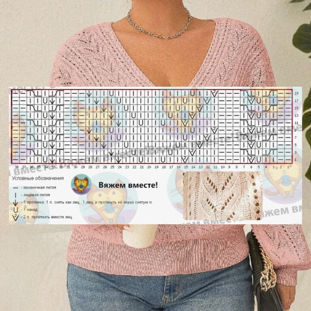 Раппорт узора равен 38 петлям по ширине и 10 рядам по высоте. Обратите внимание, что на схеме даны только лицевые ряды вязания, изнаночные вяжутся так, как лежат петли на спице.