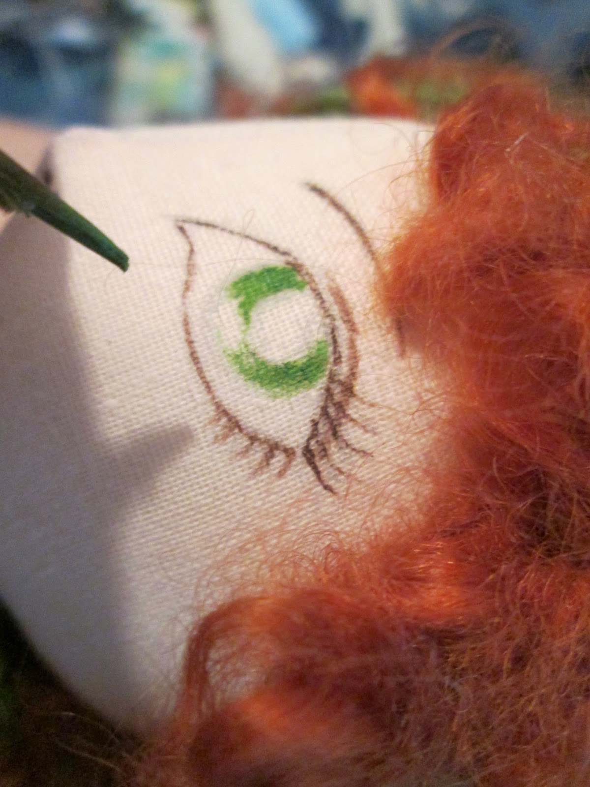Теперь непосредственно личико.Я рисую его от руки простым средне-мягким карандашом,очень остро заточенным,чтобы линии были тонкими(ластик кстати их убирает,а ткань натянута очень плотно,так что это способствует)