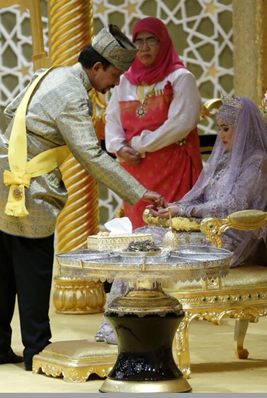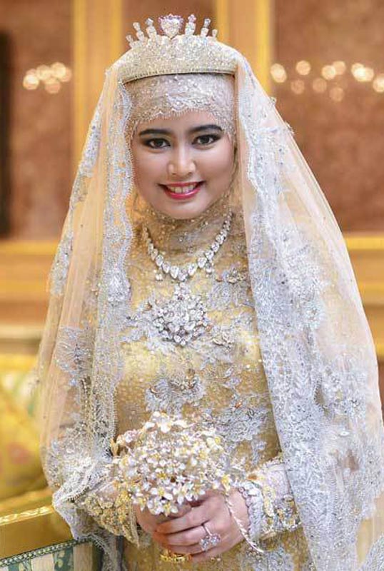 Россыпь изумрудов, рубинов и бриллиантов в колье, браслетах и, не побоюсь этого слова, кокошнике на фоне платья невесты в серебряном платье затмевает своим блеском всё вокруг. Празднование свадьбы проходило в Тронном зале дворца султана, Истана Нурул Иман («Дворец света»).