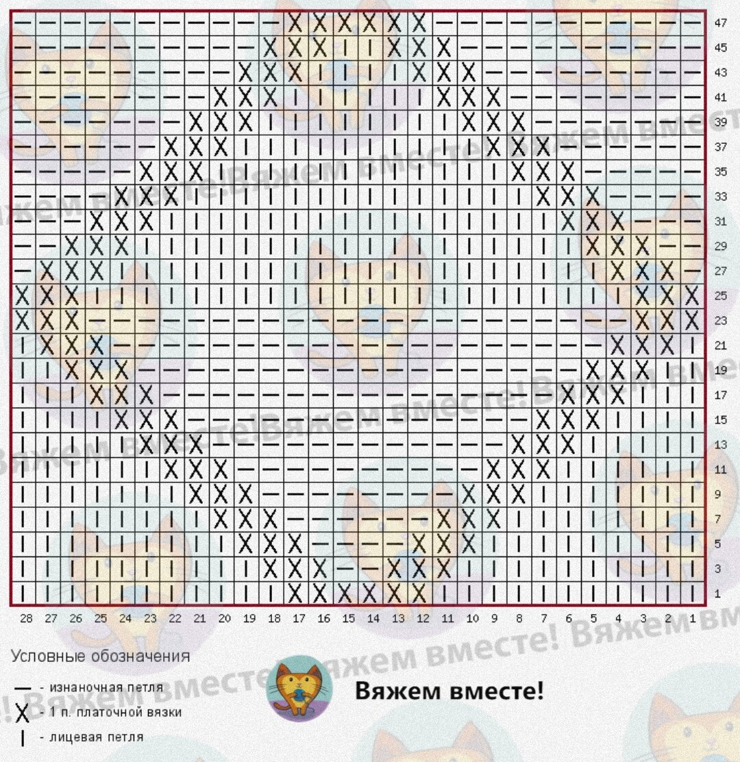 Раппорт узора равен 28 петлям по ширине и 48 рядам по высоте, выделен красной рамкой на схеме. Чётные ряды узора вяжутся так, как петли лежат на спице.