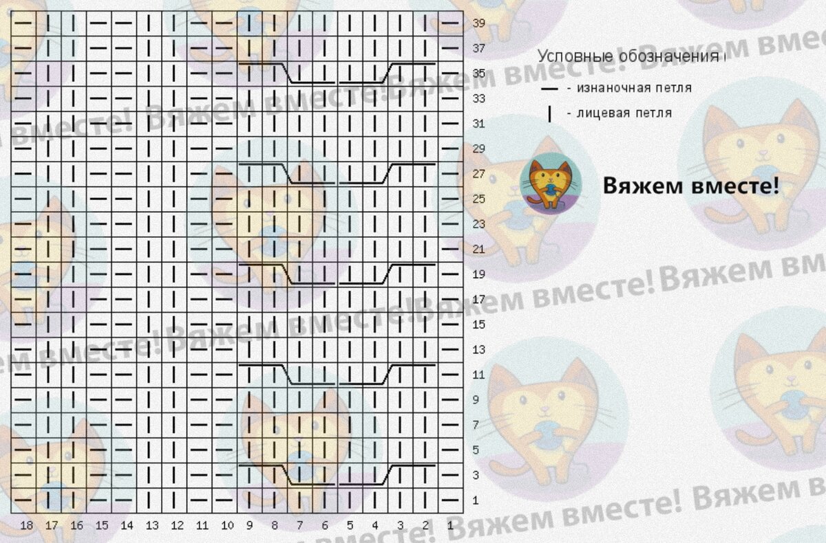 Перед и рукава изделия вяжутся одним узором по схеме, а узор спинки чередует в себе только лицевые и изнаночные дорожки разной ширины.
