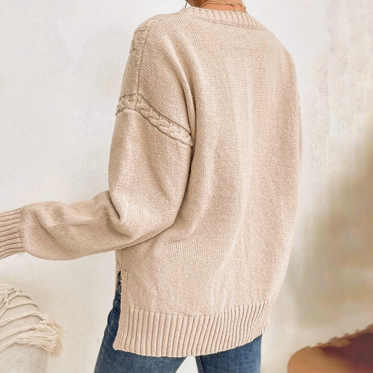 лаконичная модель, которая дополнит базовый гардероб, — серо-бежевый джемпер с вертикальными косами и ажурными вкраплениями по бокам детали переда.