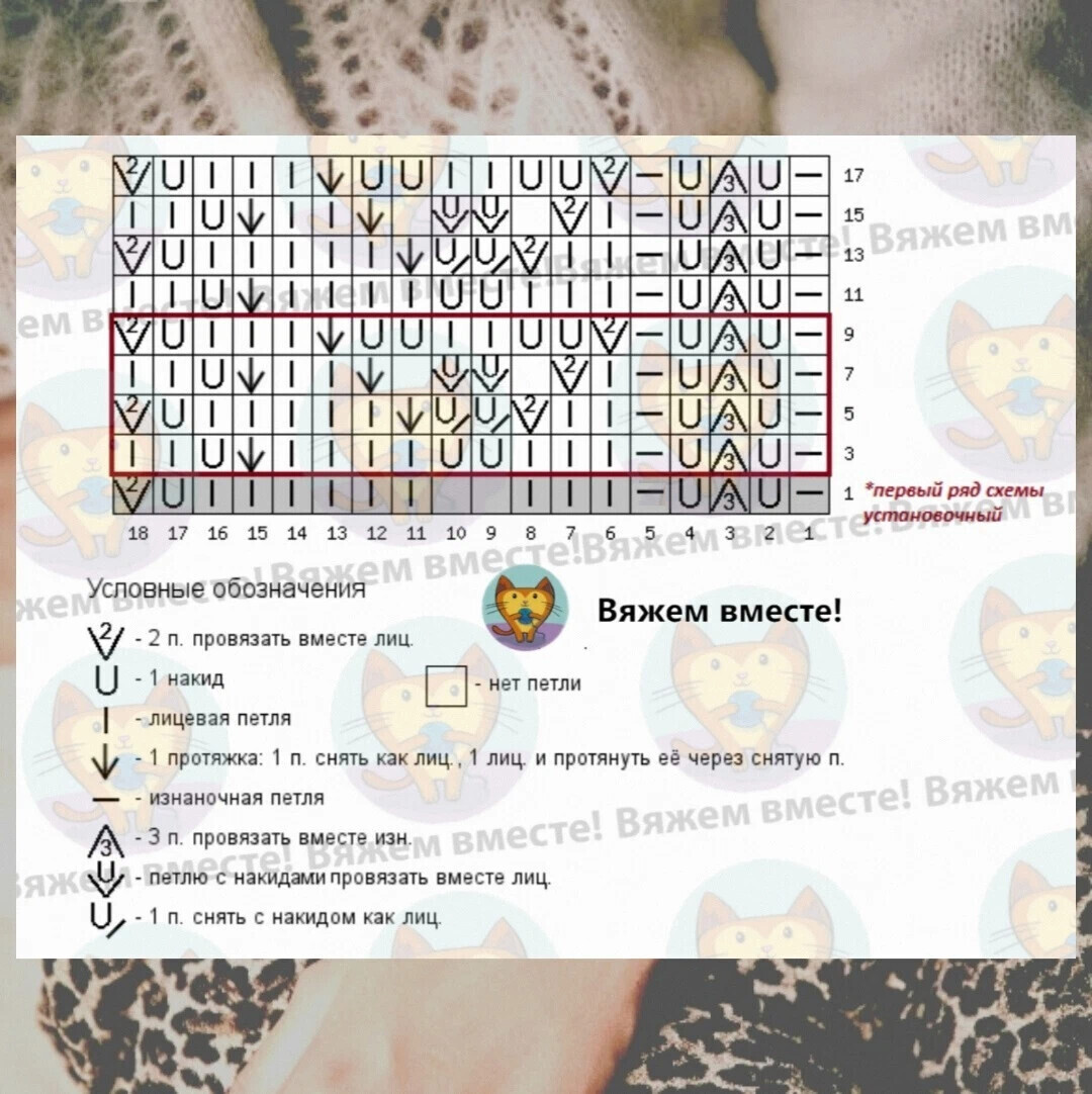 Раппорт узора равен 18 петлям по ширине и 10 рядам по высоте, на схеме даны только лицевые ряды вязания, чётные вяжутся так, как лежат петли на спице, в некоторых рядах с особенностями, о которых написала выше.