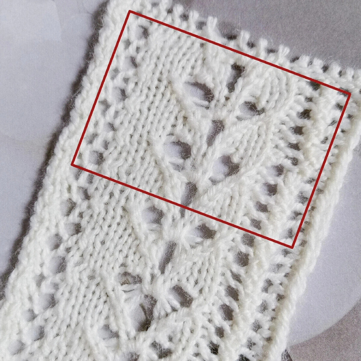 В первую очередь это двойные накиды, из которых вывязываются две петли. Во-вторых, центральный двойной накид (9 и 10 петли и 1-ый ряд раппорта) в следующих за ним рядах не провязывается, а переснимается с выполнением накида и так три ряда подряд (в 4-ом, 5-ом и 6-ом рядах), а в 7-ом ряду из накидов вывязываются две петли.
