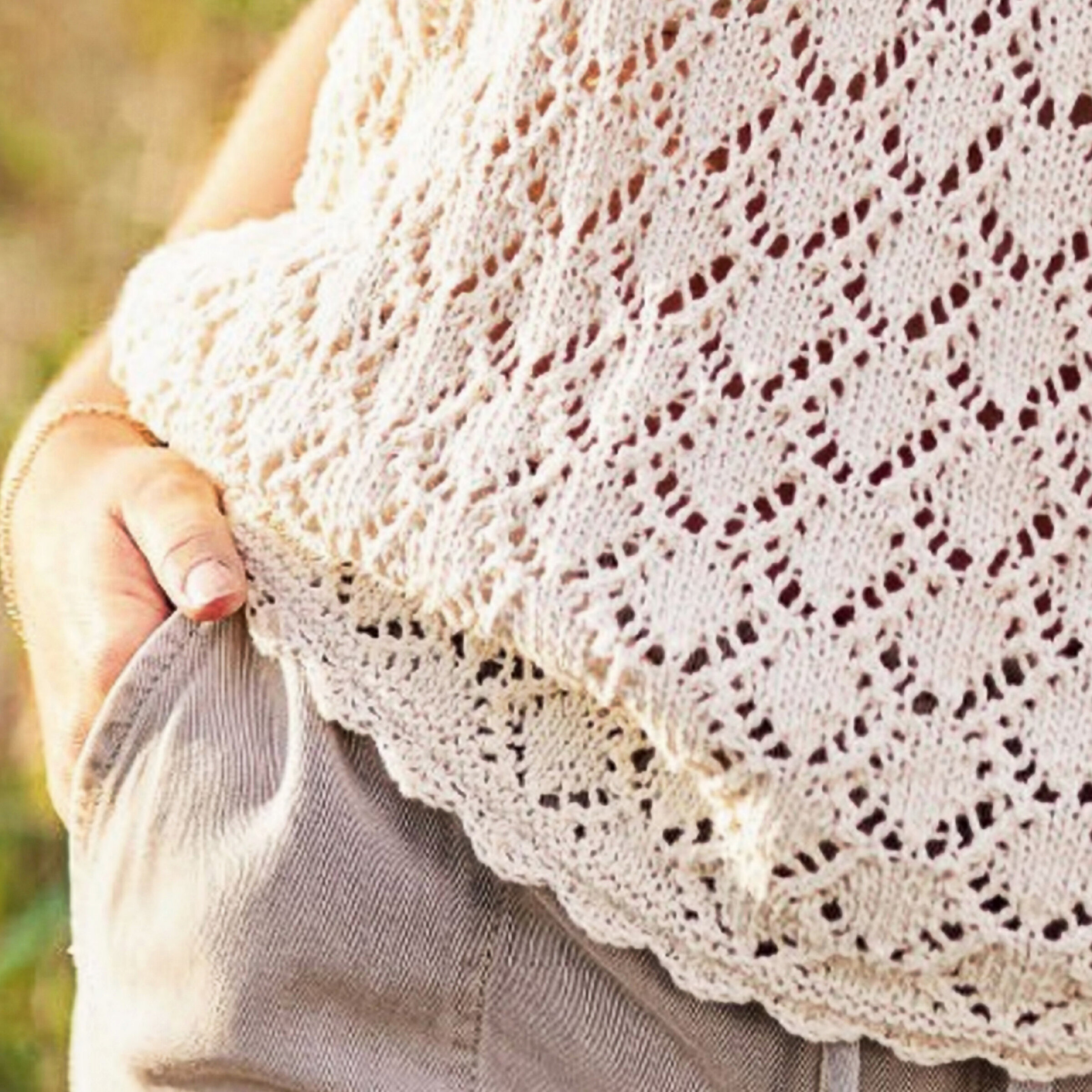 Рельефный верх, связанный платочкой, и ажурный низ с короткими рукавчиками из классических ромбов. Деликатная фестончатая отделка по краю.