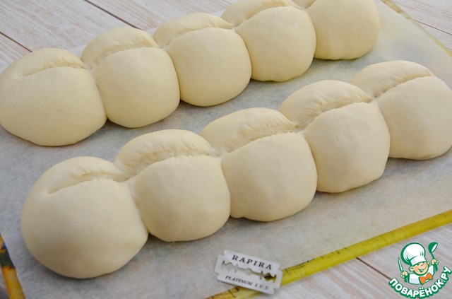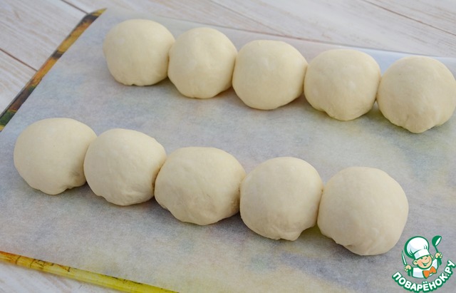 Тесто обмять, разделить на 10 кусочков, сформовать булочки, выложить их на доску застеленную пекарской бумагой близко друг у другу (по 5 шт), накрыть пищевой пленкой смазанной слегка растительным маслом и оставить на расстойку около 1 часа |