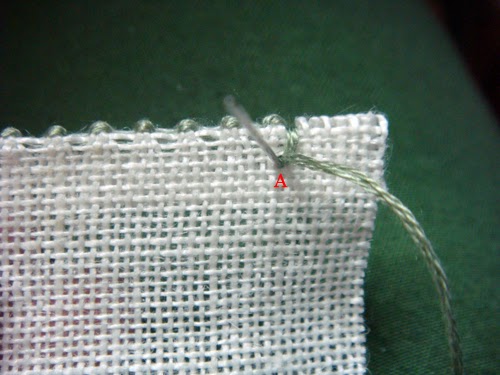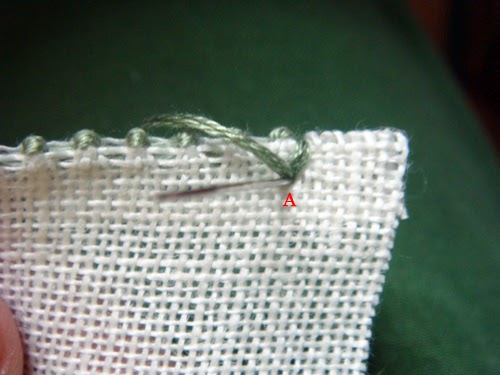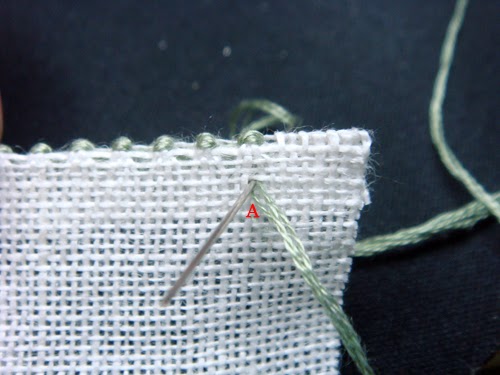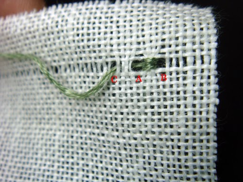 Возьмите иглу в А затем снова сшить три раза. (BA)