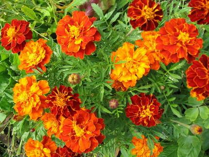 Хорошую устойчивость к неблагоприятным погодным условиям проявляют бархатцы сортогруппы Карнавал (Orange, Red, Queen, Granada, Marietta). Эти растения имеют немахровые соцветия разнообразных окрасок диаметром до 7 см и образуют кустики высотой до 25 см.