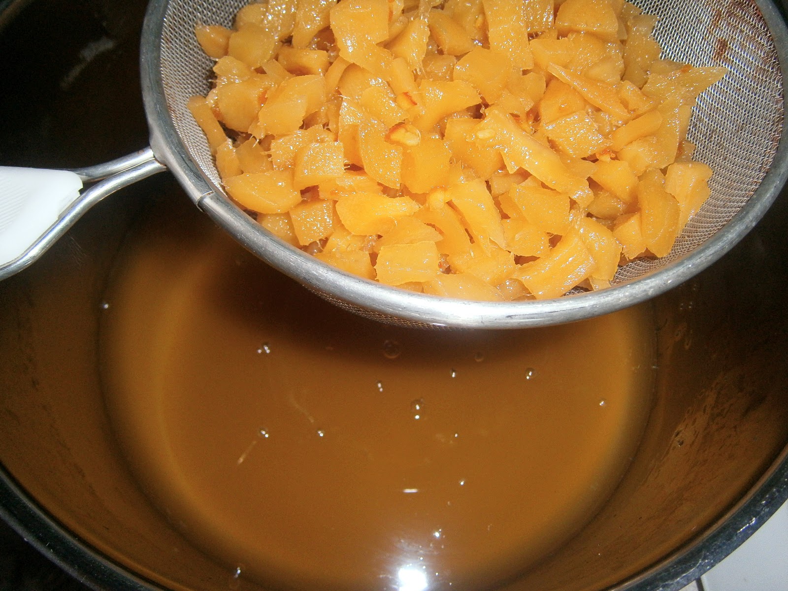 На второй и третий день вскипятить имбирь, на слабом огне варить минут 20 и снова остудить. Если сироп слишком густой - добавить воды и вскипятить. На 4 день снова заварить, поварить, пока имбирь станет мягче. Можно каждый день пробовать по кусочку, в первые дни он слишком твёрдый. Иногда можно эту процедуру кипячения повторять до 6 дней. Остывший имбирь поместить в дуршлаг, дать сиропу стечь, сироп не выливать, а имбирь разложить на пекарской бумаге обсохнуть. За это время можно приготовить имбирно-лимонный сироп.