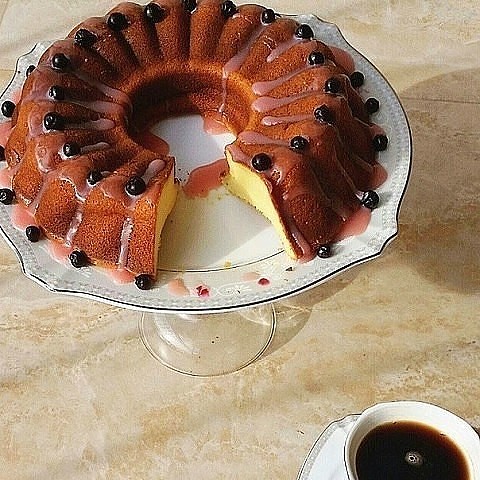 1. Яйца взбить, добавить сахар+ванилин, масло (растопленное), перемешать, добавить соду, затем творог, взбить до однородной массы, добавить муку, взбить. 2. Вылить массу в смазанную растит. маслом форму. 3. Выпекать при 180 С до золотистого цвета, примерно 40 мин. 4. Сверху полить глазурью из розового шоколада (в миске на водяной бане растапливаем шоколад, подливаем сливки, густоту регулируем на глаз, даем глазури немного остыть и поливаем кекс), украшаем ягодами.