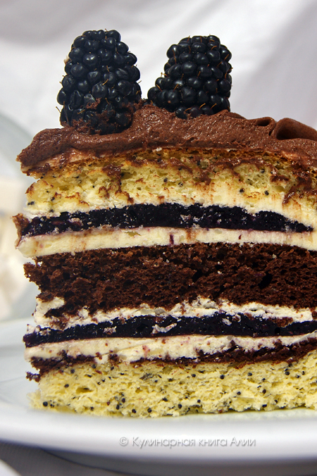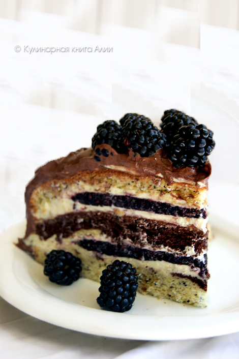 Моему старшему сыну очень понравился торт "Орбита", и когда он снова попросил меня его приготовить, то я решила его чуть изменить - вместо клубники взяла ежевику, а один корж сделала с какао... и украсила шоколадным шанти.
