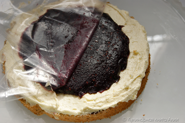 При сборке торта брала пакетик с застывшей ежевикой и переворачивала, пакетик убирала - очень удобно. Т.к. ежевики мало, она у меня не на весь корж