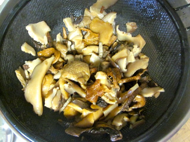 Если используем сушеные грибы, то сначала регидрируем их следующим способом: варим в кипящей воде 3 минуты, а затем настаиваем под крышкой 40 минут. Промываем и дальше используем, как свежие грибы.