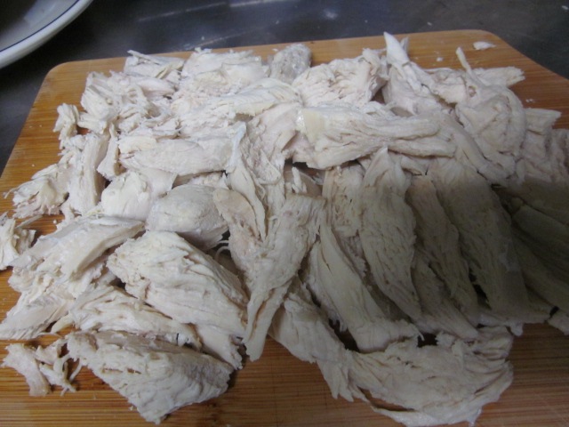 Курятину отвариваем до готовности, примерно 20 минут, и разбираем руками или вилками на волокна, не очень мелко.