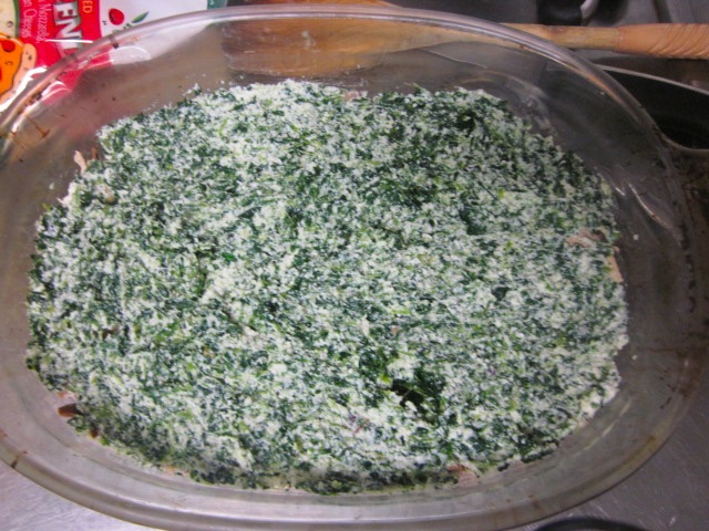Далее посыпаем третью моцареллы и кладем половину рикотты со шпинатом.