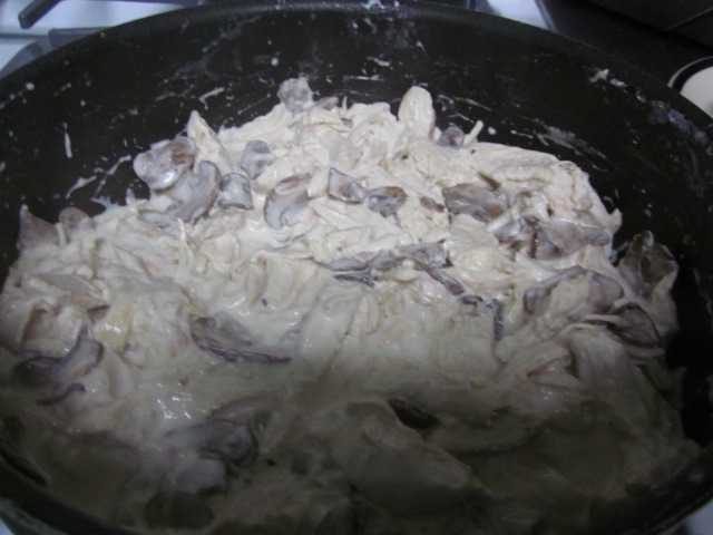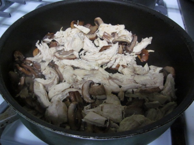 Добавляем к грибам отварную курятину, готовим еще 1-2 минуты.
