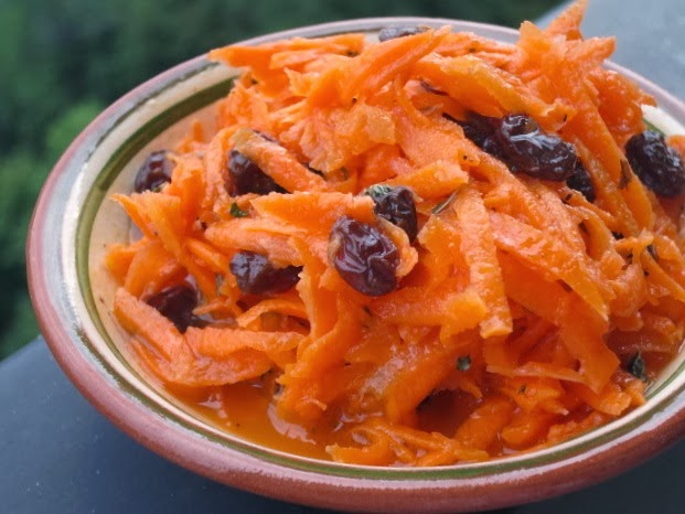 Салатов из тертой моркови много не бывает! У меня в блоге уже есть варианты морковных салатов с пряностями, с хреном, с йогуртом... В этом варианте в салат добавляются изюм и мята, а заправляется он лимонным и апельсиновым соком. Сладковатый изюм и кисленькие цитрусовые отлично сочетаются со свежей и сочной морковкой. Рецепт взят из очень хорошей книги "The Silver Palate Cookbook," по которой я недавно готовила курицу "Марбелла."