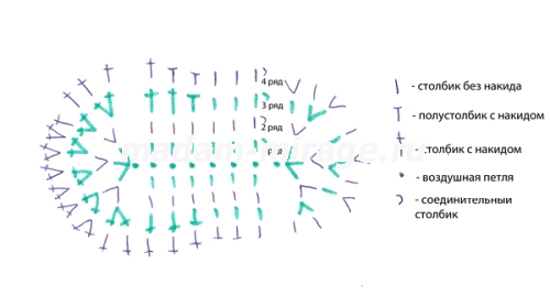 2 ряд: 6 в. п. подъема, 5 сс4н, 2 в. п., 10 сс4н, 2 в. п., 6 сс4н