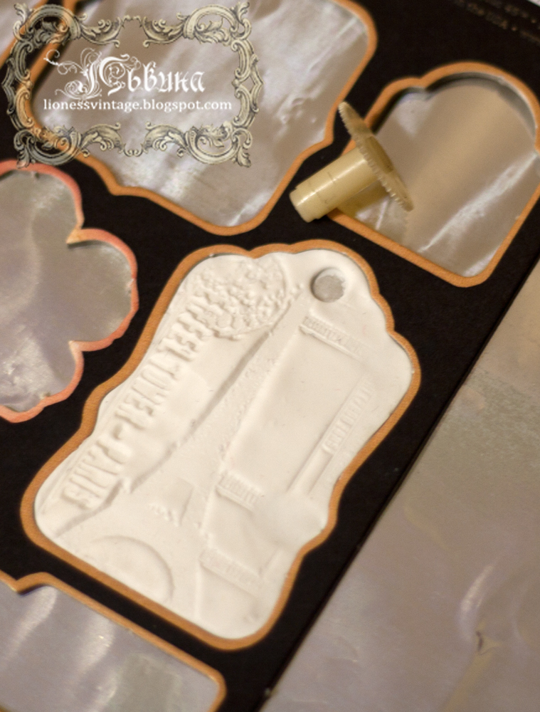 Достаем пластику, штампы, краски, пудру для эмбоссинга и остатки от чипборда - это послужит нам трафаретом.