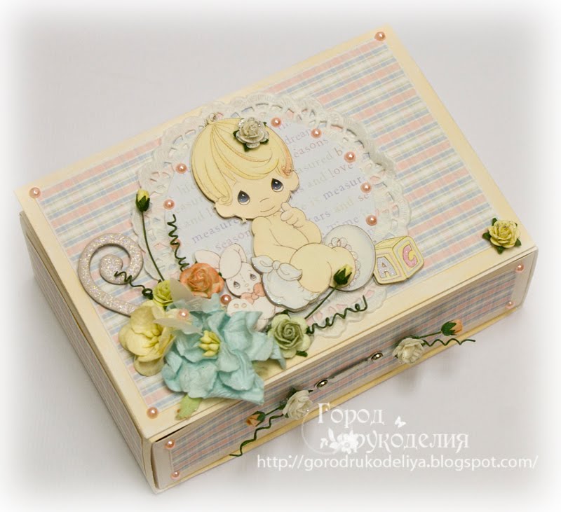 теперь делаем крышку. Я думаю все не раз видели открытки подобного типа, поэтому особо объяснять тут тоже не надо: приклеиваем крышечку к задней стенке коробки. Вырезаем верхнюю часть, которую будем декорировать, размером как верх коробки и приклеиваем к крышке